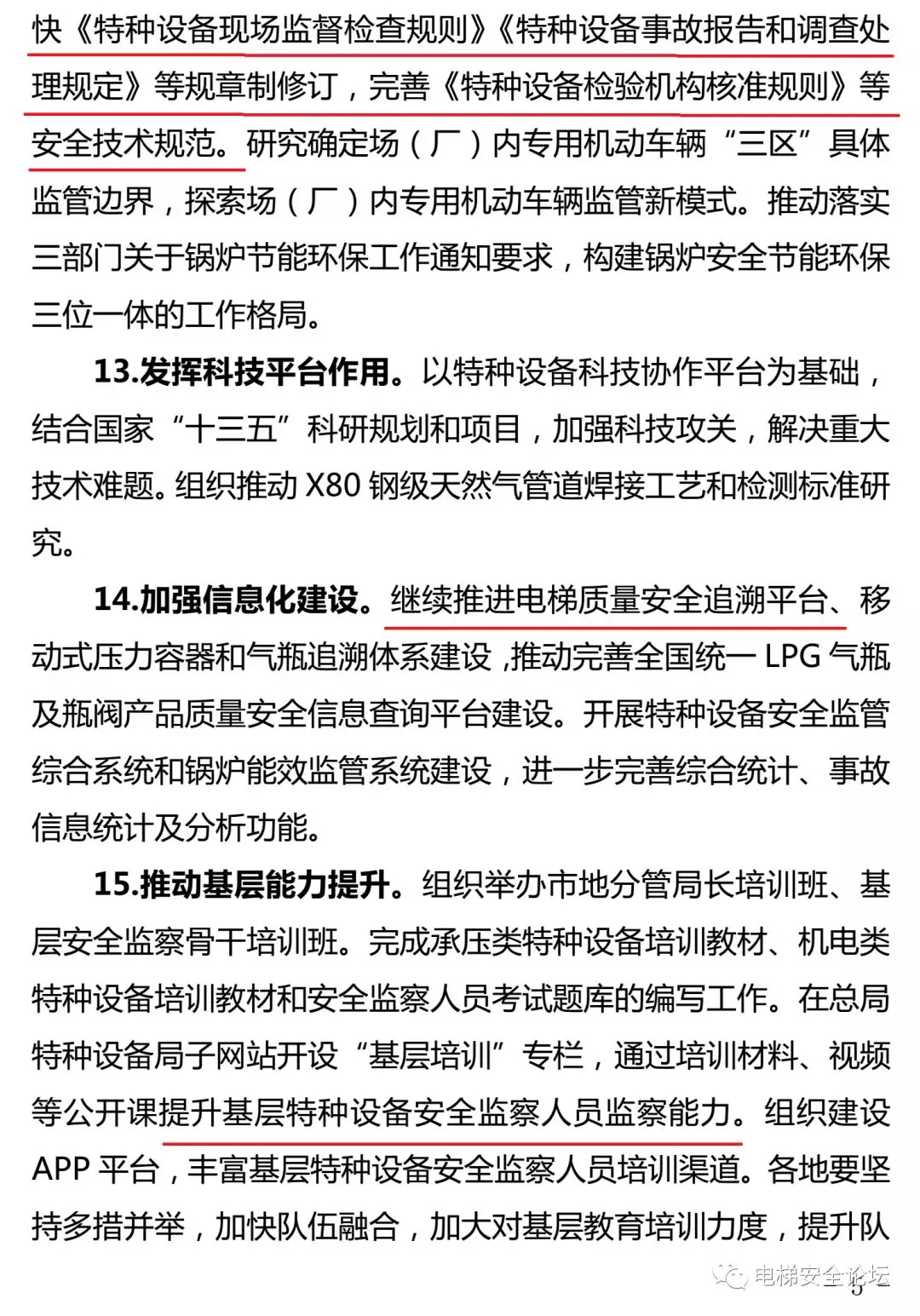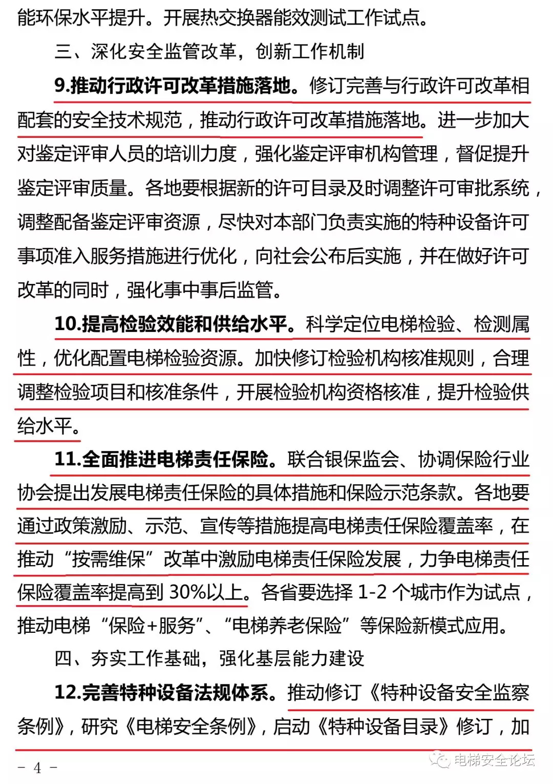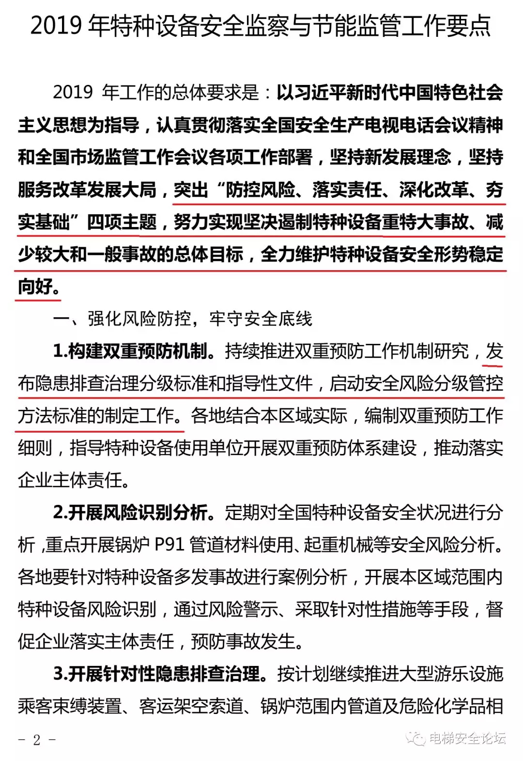 與那首曾經(jīng)【90后們可能不一定聽(tīng)過(guò)】唱遍大江南北、曾經(jīng)很火很火歌曲的歌詞“2002年的第一場(chǎng)雪,比以往時(shí)候來(lái)的更晚一些”不同,今年的《特種設(shè)備安全監(jiān)察與節(jié)能監(jiān)管工作要點(diǎn)》似乎比往年來(lái)的更早一些。粗略讀完,第一感覺(jué)是任務(wù)艱巨、干貨滿滿,同時(shí)也深感總局特種設(shè)備安全監(jiān)察局的各位領(lǐng)導(dǎo)工作真是不容易,肩負(fù)重?fù)?dān)、工作壓力可想而知,那可不是一般的大??! 比如在工作要點(diǎn)中明確: 修訂完善與行政許可改革相配套的安全技術(shù)規(guī)范,推動(dòng)行政許可改革措施落地。 科學(xué)定位電梯檢驗(yàn)、檢測(cè)屬性,優(yōu)化配置電梯檢驗(yàn)資源。加快修訂檢驗(yàn)機(jī)構(gòu)核準(zhǔn)規(guī)則,合理調(diào)整檢驗(yàn)項(xiàng)目和核準(zhǔn)條件,開(kāi)展檢驗(yàn)機(jī)構(gòu)資格核準(zhǔn),提升檢驗(yàn)供給水平。 在推動(dòng)“按需維保”改革中激勵(lì)電梯責(zé)任保險(xiǎn)發(fā)展,力爭(zhēng)電梯責(zé)任保險(xiǎn)覆蓋率提高到30%以上。 推動(dòng)修訂《特種設(shè)備安全監(jiān)察條例》,研究《電梯安全條例》,啟動(dòng)《特種設(shè)備目錄》修訂。。。。。等等。 不再往下羅列下去了,詳細(xì)內(nèi)容大家就慢慢仔細(xì)看吧!其中任何一項(xiàng)都是艱巨的任務(wù)?。?/span>