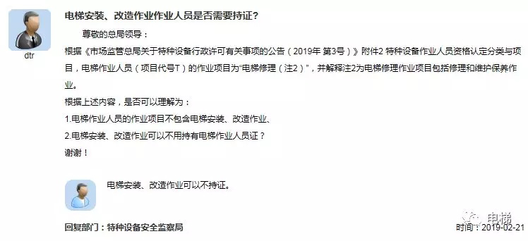 總局:電梯安裝、改造作業(yè)可以不持證。 |